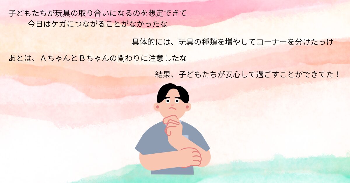例えば、私は保育士の仕事をしているときに、子どもたちの頻繁にトラブル起こしていましたが、環境や関わりを工夫することで怪我を防ぐことができていました。